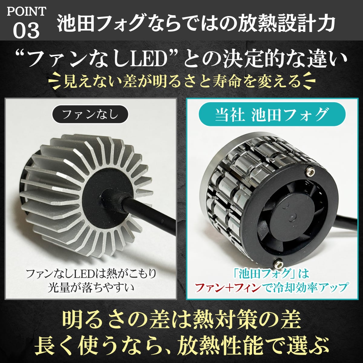 明るいLEDはどうしても熱を持ちます。熱を感知するとユニット内のセンサーが電力を抑え、暗くなります。そこで冷却機能が重要になってきます。点灯直後からほとんど同じ明るさを維持します!また、熱によるトラブルも防ぎます。