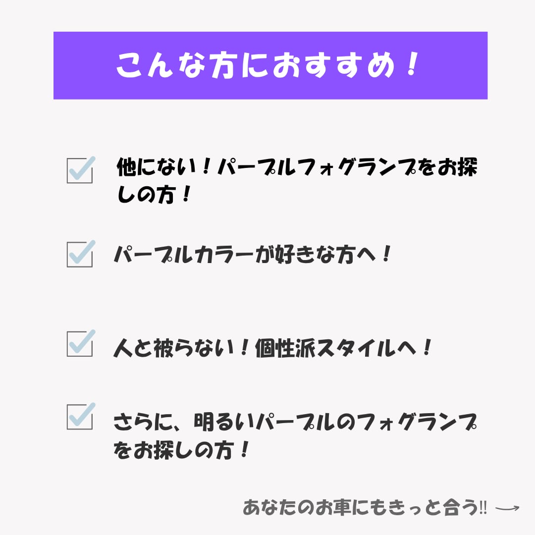 ・紫が好きでパープルフォグにしたいけどドンピシャのフォグランプが見つからないという方方にぜひ使用して頂きたいです!この色味なのにしっかり明るく必ず満足していただけると思います。パープルは明るくするのは難しいですがなんとか完成しました。