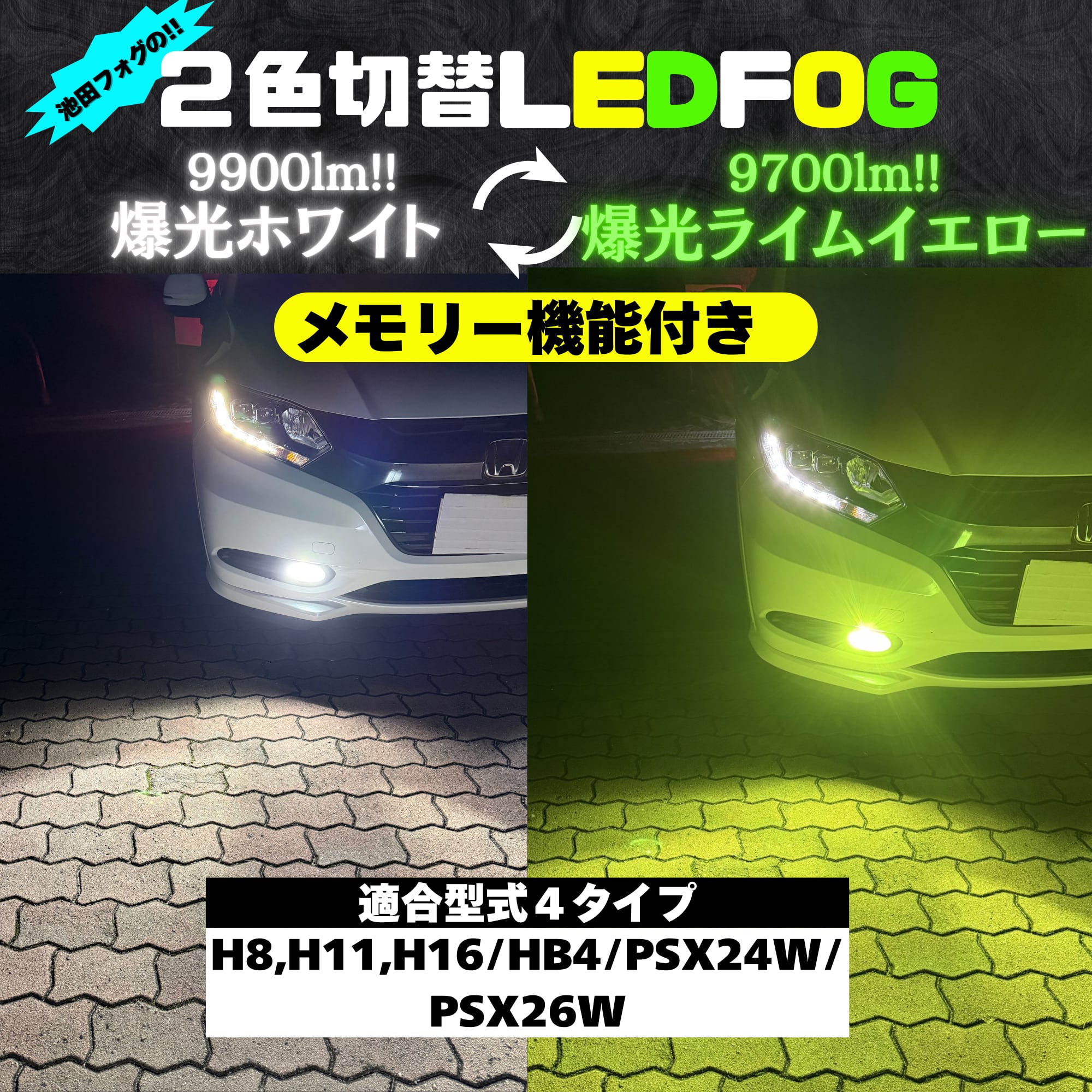 爆光 2色切替 メモリー機能搭載 フォグランプ 10100lmホワイト×ライムイエロー H8 H11 H16 HB4 psx24w psx26w 池田フォグ 110W 特注チップ 2本1セット